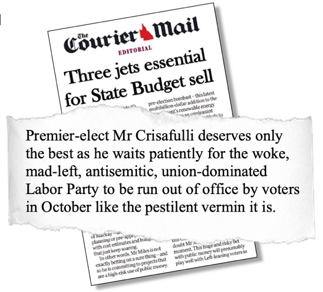 Mr Crisafulli said he was pleased to have the support of Brisbane daily turdbloid The Courier-Mail (main picture) for his decision to travel the state promoting Labor’s spending initiatives for the 2024-2025 financial year as well as the forward estimates to 2027-2028.
