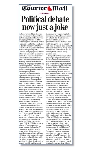 The Courier-Mail was so outraged at the level of debate that it editorialised against it, taking the opportunity of course to give Labor a huge swipe on the way through. (below)