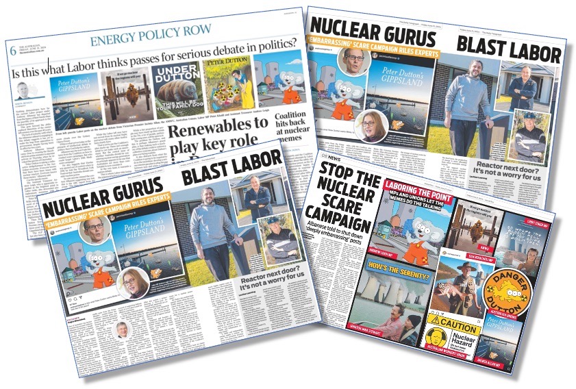 Our MGH researchers point to the hysterical and coordinated efforts across News Crap Australia’s turdbloids and broadshits to denigrate the social media efforts by Labor and other anti-nuke individuals and groups who have used pop culture references to ridicule the Liberals’ new “policy”. (below)