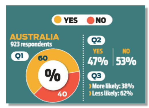 However, nationwide results for two other questions revealed a majority – 53% nationwide but higher in many specific regions – would not be comfortable having a nuclear power plant in their state or region. A third question showed 62% of respondents would be less likely to vote for Peter Dutton as a result of his nuclear power plans. (below)