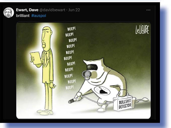And while we don’t normally feature mainstream cartoonist with their own monster forums to promote themselves, we couldn’t go past Ewart, Dave’s little tribute to a fine piece of work from Glen Le Lievre. Bullshit detector, indeed!