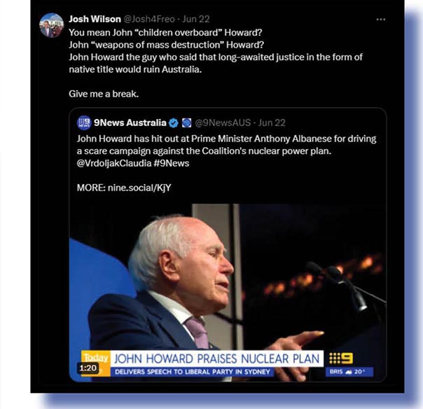 And Josh Wilson brought dear old Johnny Howard into the debate, seeing the Man of Steel/The Unhanged War Criminal was wheeled out to support Dutton’s nuclear plans. When you need Howard’s help to sell anything, then you really are in trouble.