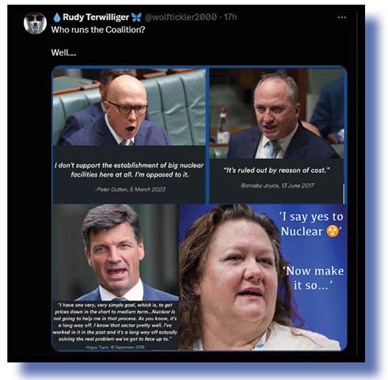 Rudy Terwilliger had some thoughts on who is really behind the Coalition’s new-found interest in seven nuclear power-plants, with numerous reactors at many of the sites.