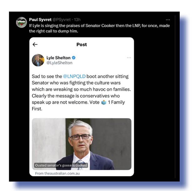 Paul Syvret on Lyle Shelton’s defence of an axed LNP cooker….