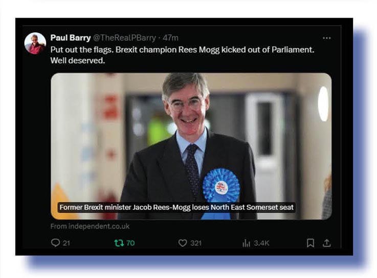 Politicians also copped a good plopping from our Xers – or should we say ex-politicians in the case of Jacob Rees Mogg who lost his House of commons seat last Thursday UK time – with this from someone named Paul Barry…..