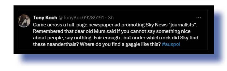 Okay, now for some posts poking fun at members of our nation’s woeful mainstream mediocre. And who better to start with than multi-Walkley award winning and journalism hall-of-famer Tony Koch, who had the “journos” at Sky News Australian clearly in his sights!