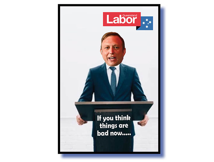 The main slogan is understood to go hand in hand with the kicker line “…Crisafulli will really cock everything up!”