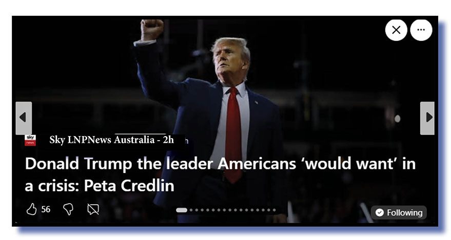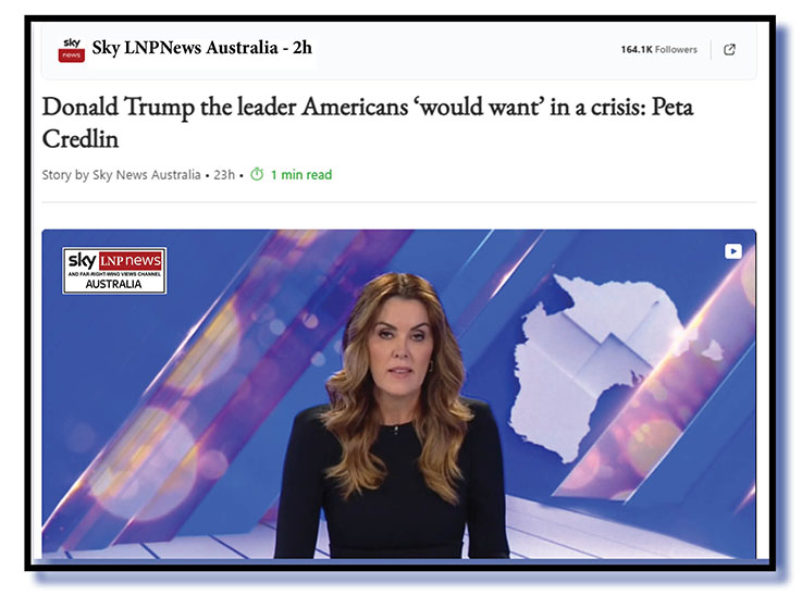 In one of those short, sharp news bites that Sky LNPNews Australia floods the Microsoft Start search engine, often multiple times daily, Credlin said Trump was the man needed to run the US in a crisis. And she clearly believes the US is now in an existential crisis.