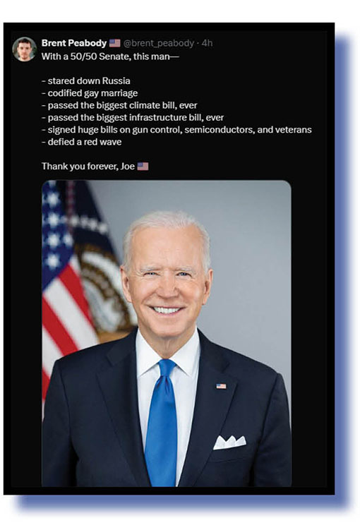 Before we move onto more anti-Trump Xcrhetoric, let’s hear some nice words about Joe Biden’s time as president. Take it away, Everard Compton, Politic@l Spinner and Brent Peabody.