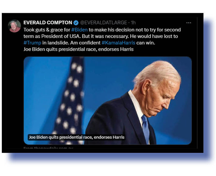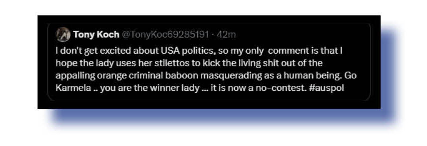 Our judges decided to wrap the blue riband this week around the neck of celebrated retired journalist Tony Koch, for his heartfelt support (above and below) for Kamala Harris should she become the Democrats’ presidential candidate.