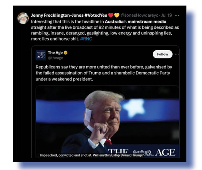 Also offering very harsh words about Trump was Jenny Frecklington-Jones, et, etc, who xcremented on his rambling speech at the Republican National Convention while having a dig at the Australian mainstream mediocre in the process.