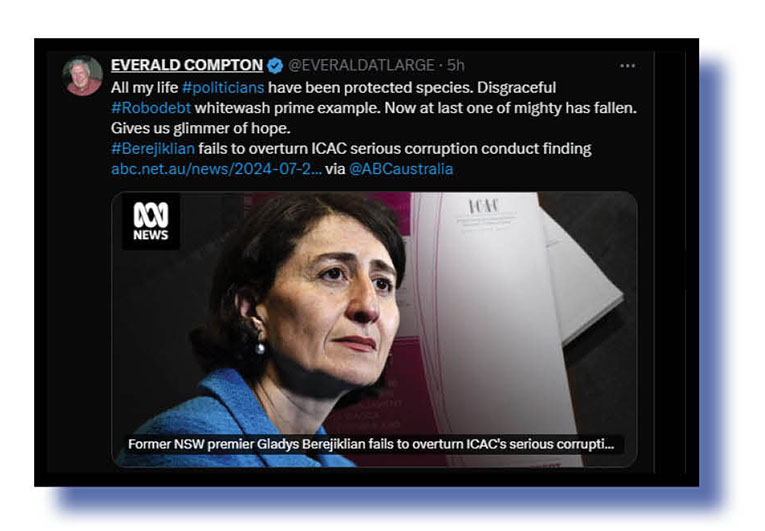 Onto domestic politics now, and Glady “I can’t come into work today as I’m a little crook!” Berejiklian’s failed bid to clear her name of an ICAC corruption finding caught the attention of Everald Compton and Rupert’s Conscience.
