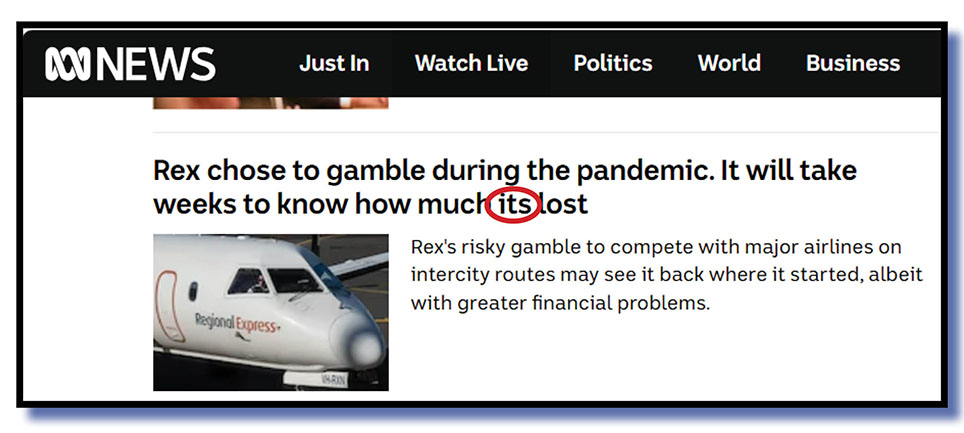 And a late one this morning (Thursday) from the ABC online, with the incorrect use of the possessive “its”.