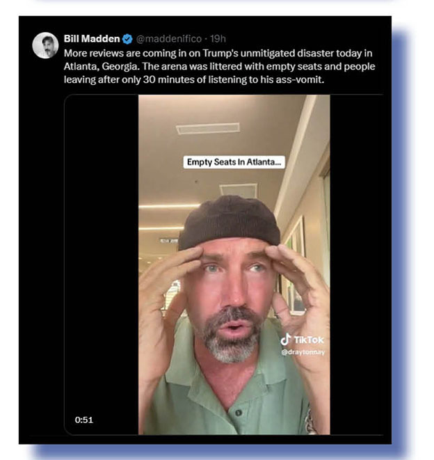 On now to the US presidential elections, and Bill Madden was among many Xcretas who took some glee out of observing that the Tangarine ShitGibbon’s crowd at a recent Atlanta rally shrunk alarmingly as the poor old demented felon – sorry, fella – rambled on incoherently as is his wont.