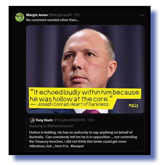Sorry if we’re spoiling anybody’s breakfast out there but we’re kicking off this second tranche of our Xcrements-of-the-Week with some posts concerning our current prime-minister-in-waiting, the caring and inclusive and kind-of-heart Peter Dutton.