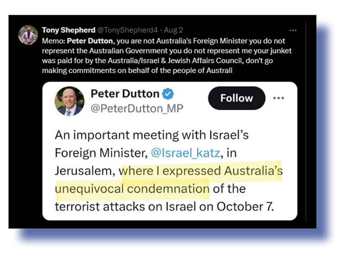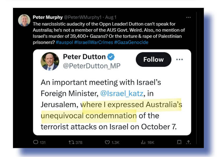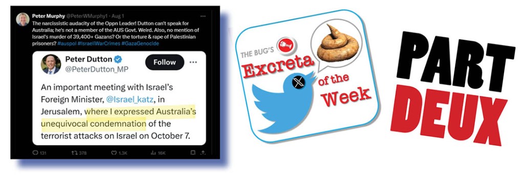 One Xcreta pissed off with Dutton speaking on behalf of all of us was Peter Murphy (above and below). We share his anger: Dutton has no right to go over there and talk endlessly about what Hamas did on October 6 and basically ignore what Israel has been doing in Gaza ever since (The Bug calls it genocide), as being simply a wonderful nation exercising its right to defend itself. Right, Penny? Right, Albo?