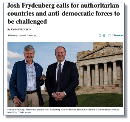 In comments after news of the award broke, Mr Frydenberg called for Australia to confront authoritarian regimes abroad and defeat anti-democratic forces at home.