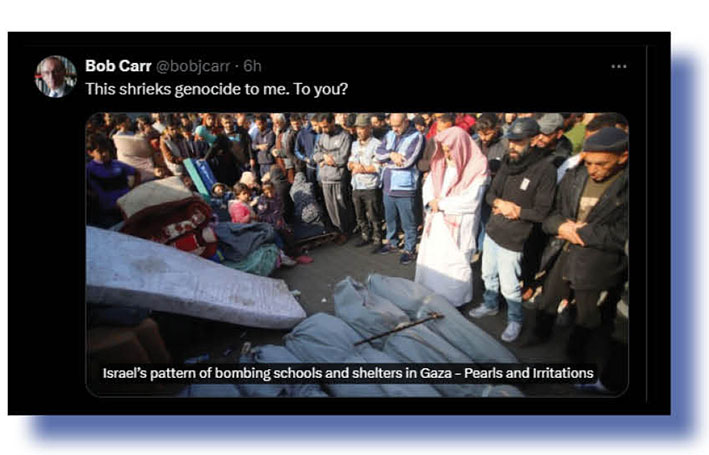 Before we leave what’s left of Gaza – and to be fair there isn’t much left but the Israeli Defence Force’s work is not totally done there yet – let’s hear from Khalissee, Bob Carr and a second nibble from Mike Carlton.