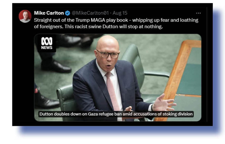 The ever-scathing TOM RED had fun with the general idea that the racist Peter Dutton’s sole intention with his Gaza ban was to appeal to other racists out there in the general Australian population. The Blame Game indeed!