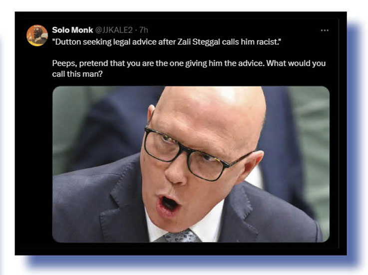 Sadly, it’s now back to domestic political issues and we kick off with news that racist Opposition Leader Peter Dutton has been very hurt indeed by comments by Zali Steggall outside the safety of the coward’s castle (parliament) that he is indeed racist!