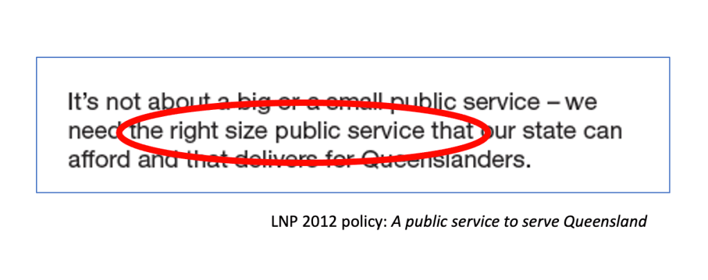 The LNP, when last in office, tried to achieve the promised “right size” by sacking 14,000 public sector workers, a move that helped it depart office in 2015 despite having won 78 out of 89 seats at the 2012 election.