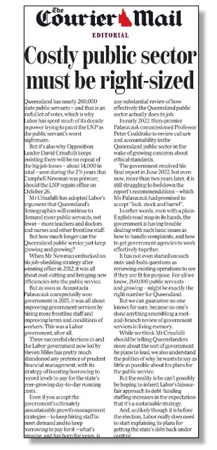 Our MGH researchers noticed the familiar sentiment contained in the heading above a recent editorial (below) that ran in conjunction with stories critical of the rise in public sector job numbers under the Labor Party state government since it took office in 2015.