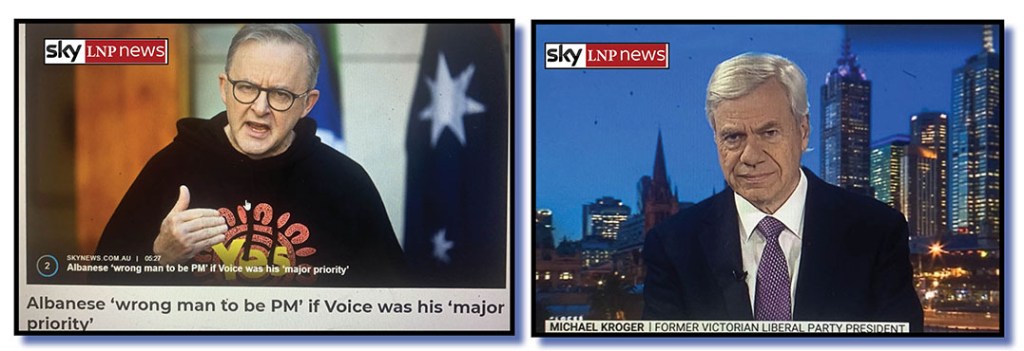 The latest example of this came a few days back with former Victorian Liberal Party president Kroger using a stint on Sky LNPNews host Sharri Markson’s program (at top) to declare that Anthony Albanese was the “wrong man to be prime minister” if the Voice was his “major priority”.