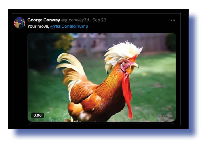 And for that reason, those judges awarded the blue riband this week to George Conway for his meme (above and below) depicting Trump as the chicken he so obviously is. Besides, most bullies are chickens deep down, right?