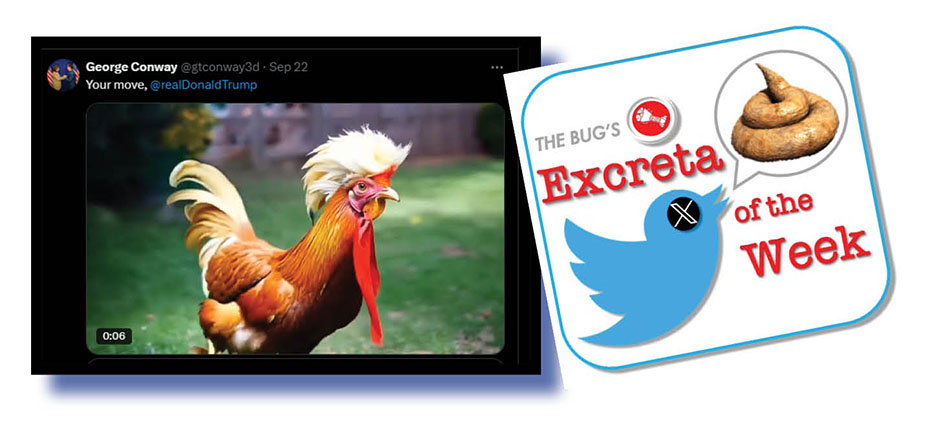 Before we leave the well-plucked Chicken Trump, The Bug would just like to add this simple observation: if the tangerine shitgibbon won the first debate so bigly, why wouldn’t he want a second? But as stated above, logical and commonsense aren’t Trump’s big suites.