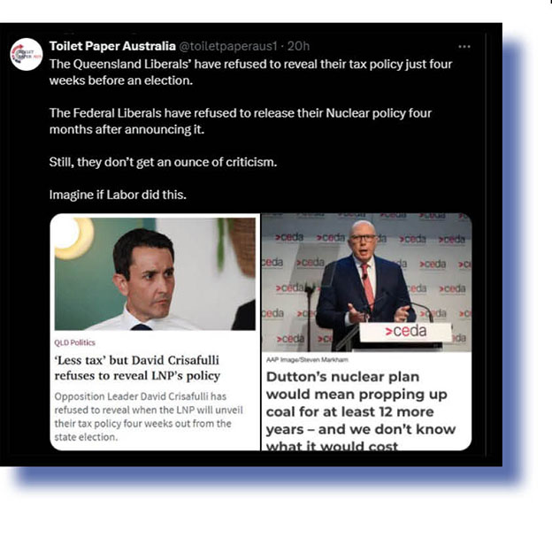 … while Toilet Paper Australia roped in the looming Queensland state election to make a similar point, adding in a barb at our nation’s mainstream mediocre in the process.