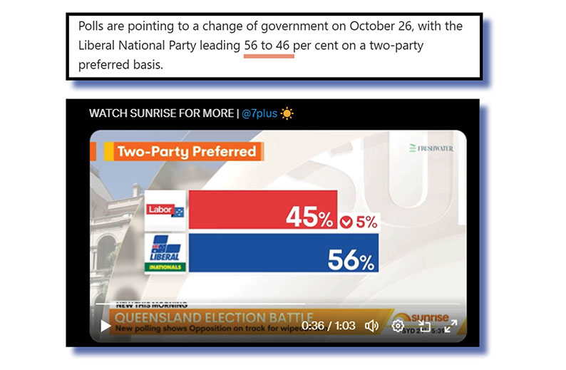 At top and below are recent examples of Seven’s Sunrise program and Australian Associated Press scribe Fraser Barton having difficulty adding up a two-party-preferred result for the looming Queensland state election and getting to the desired 100 per cent.