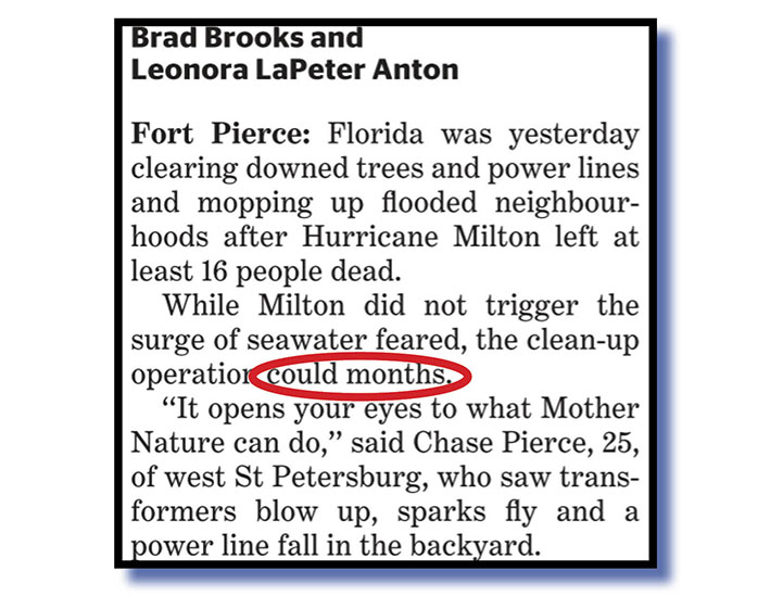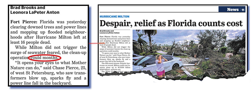 The latest glaring example comes from today’s (Saturday’s) edition of The Sydney Morning Herald, where the word “take” has mysteriously and magically sloughed itself off the page-eight report on Hurricane Milton (at top and below).
