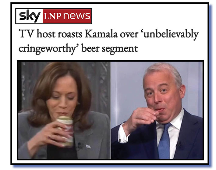 Ms Harris will happily “crack open a cold one on national TV to help along the media’s propaganda effort to get her over the line”.