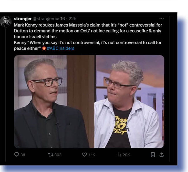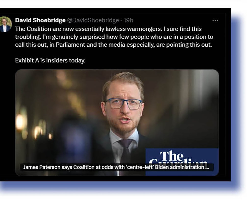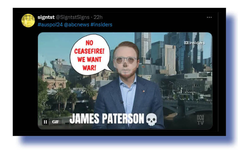 For all of you lucky enough not to see it, this former Institute of Public Affairs “luminary” spent the first half of his conversation with David Speers slamming Labor for supposedly not being in lockstep with the United States’ fulsome support on anything Israel wants to do to defend itself. With nary a blush or any sign of self-awareness, Patterson then pivoted, explaining how the LNP opposed the US call for an immediate ceasefire (hint: Labor is in lockstep with that call), declaring instead that Israel had every right to totally smash Hamas and Hezbollah once and for all! Along with countless innocent Palestinians, of course.