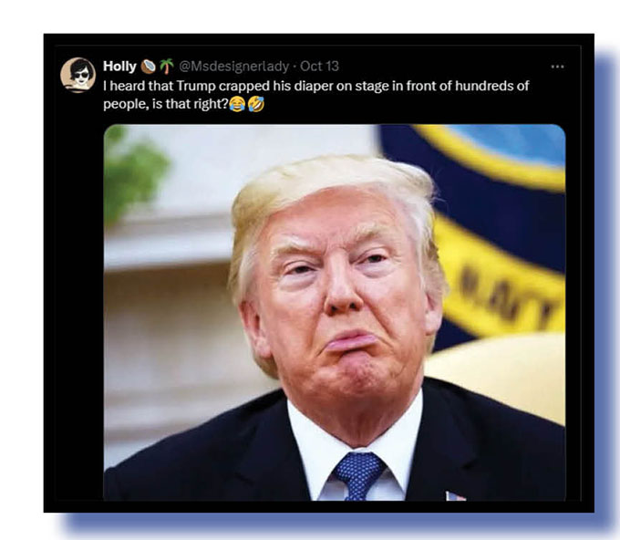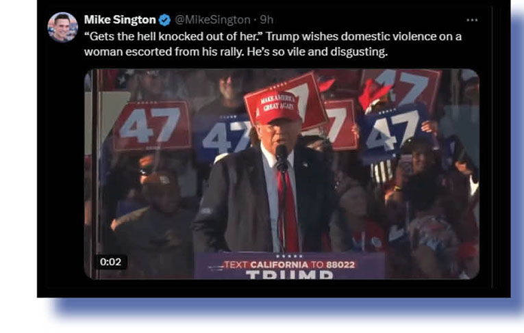 Also taking aim at other bizarre and shameful utterances from Trump at recent rallies were Mike Sington and Gavin Newsom who picked out just two examples of the convicted felon’s latest dementia-fueled rantings.