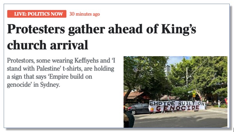 The lead item on the national broadshit The Australian’s online news site this morning concerned a protest about the Israeli government’s genocidal practices in both Gaza and Lebanon. (below)