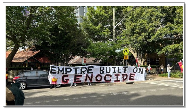 But the photo clearly showed a sign saying “Empire built on genocide.” (below)
