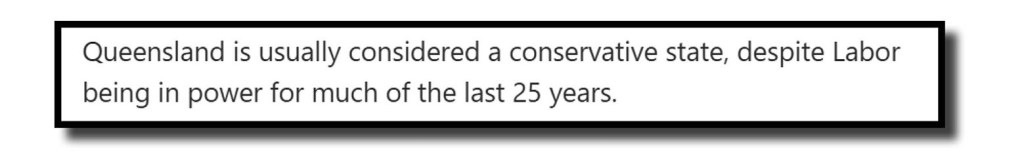 Staying with Aunty, here’s one paragraph that caught our eye from a lengthy think piece on the state election from Queensland political reporter Rachel Stewart.