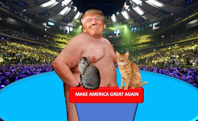 Mr Trump then drew attention to his own genitalia which he introduced to the crowd as “Arnold Palmer’s twin brother”, although there was a lengthy silence and considerable muttering as the crowd attempted to make out the small and indistinct lumps of pale, fatty, ginger flesh appearing in close-up on the stadium’s jumbo video screens.