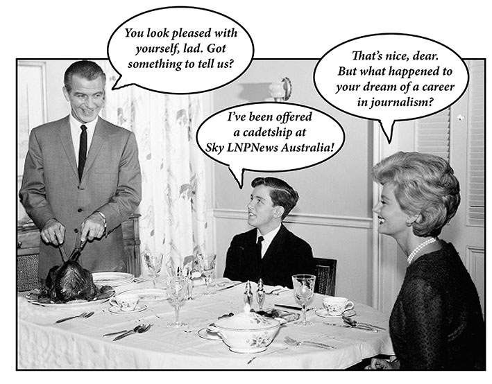All our compilers can hope for is that when these non-journalists’ paypackets lob into their non-journalists’ bank accounts, it somehow makes up for the non-stop, coital-cleansing, arse-rimming, ring-a-ding-a-ling mastery that these non-journalists perform on Rupert and Lachlan Murdoch each and every day of their working lives.