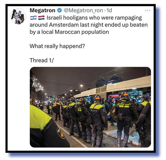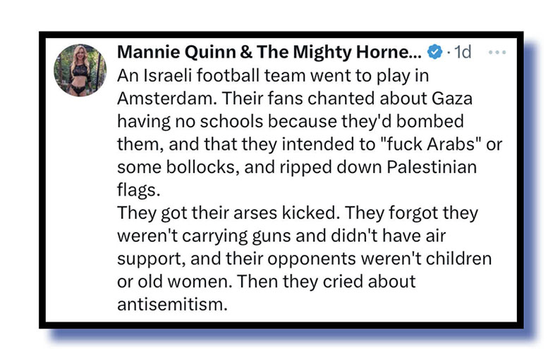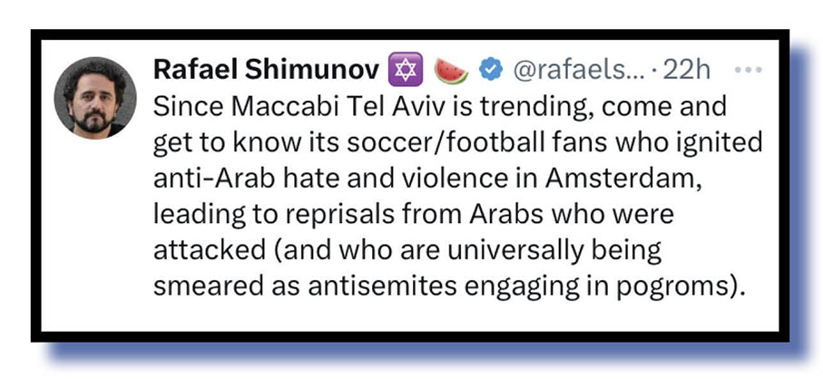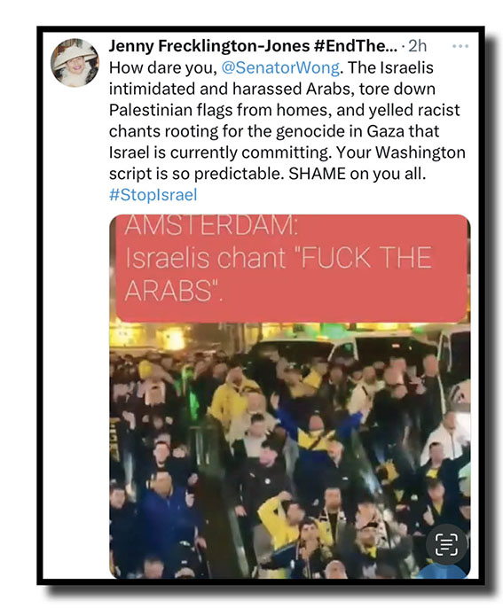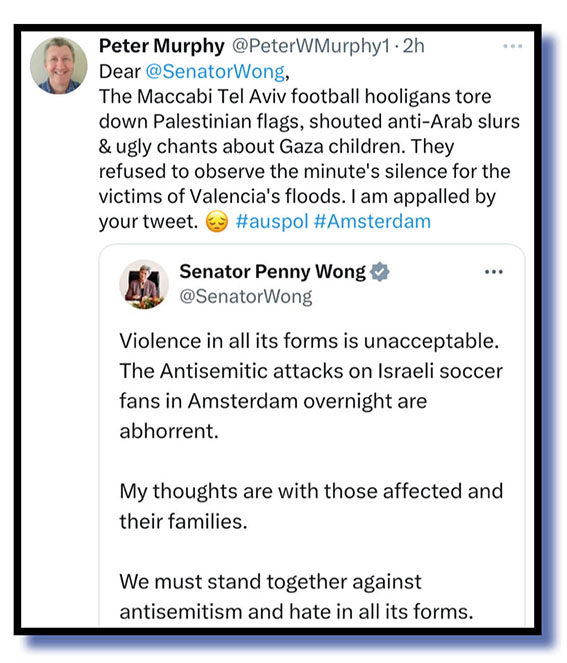 I can’t be sure of the sequence of events in Amsterdam of recent days involving charming Israeli football fans travelling abroad but I’m fairly confident Penny “We’re a long way away so it’s hard to see things clearly” Wong has yet again shot her mouth off far too soon. She really is starting to disgust me.