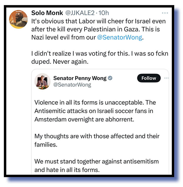 So fucking help me, if I hear one more accusation of anti-Semitism from anyone in the Zionist Albanese government against anyone who has the temerity to call out Israel for its genocide in Gaza or its latest atrocities as they raze ancient towns in south Lebanon and kill thousands of innocents in that country, Labor will be losing my vote come what May if they haven’t already.