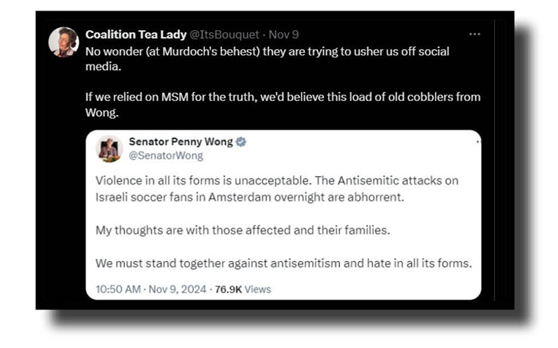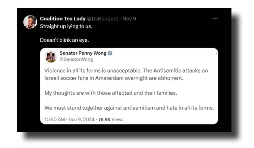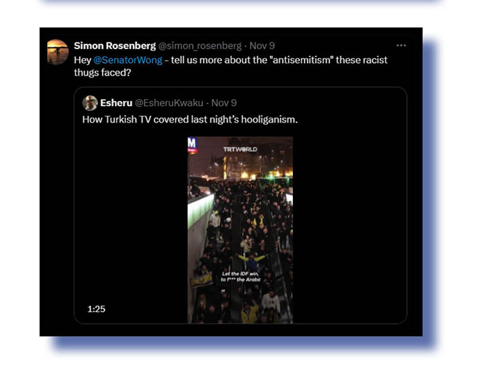 Okay! Now for Penny Wong’s moronic, ill-informed, ill-timed, defence of the Israeli football hooligans in Amsterdam as she proved once again how Zionist the Albanese government really is.