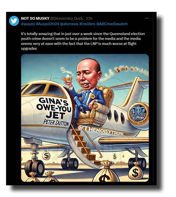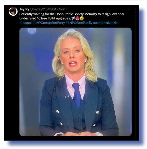 Xcretas also continued to have fun with Dutton shadow minister Bridget McKenzie, the silly billy who forgot a growing number of upgrades herself while arguing that Anthony Albanese clearly would owe Qantas favours for upgrades but her leader Dutts didn’t owe Gina Rinehart anything for asking if he could borrow her jet. Yes, she should be on the stage.