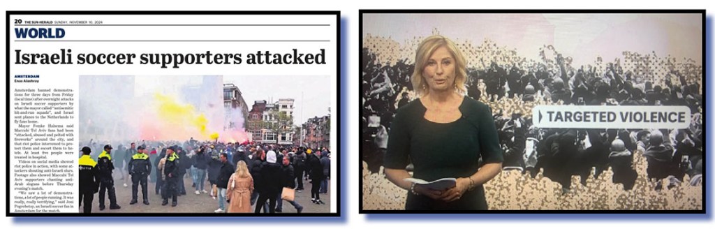 Here’s how the ABC’s 7pm bulletin began: “Tonight, Israeli soccer fans recount violent attacks in Amsterdam as the Dutch city boosts police powers and bans protests.” And a bit later on: “Israel’s Foreign Minister has met with Dutch politicians following attacks on the country’s soccer fans in Amsterdam”.