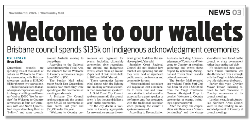 The story was about the cost of welcome to country ceremonies presented by First Nations’ representatives at local council events in South East Queensland. (below)