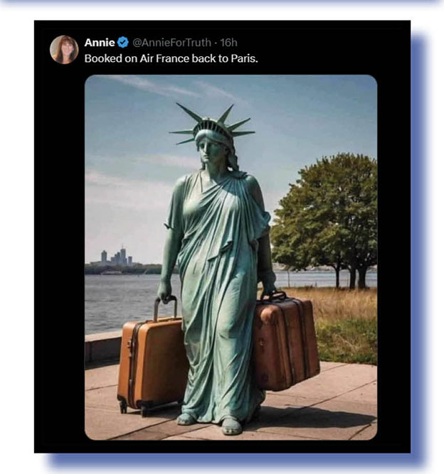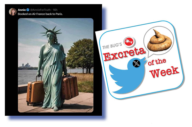 Whatever the reasons, our Xcrement-of-the-week judges couldn’t go past the brilliantly executed meme (above and below) posted on X by Annie. Can’t blame you at all, Liberty. Au revoir!