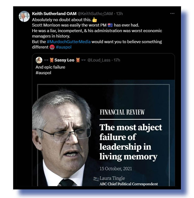 And let’s finish up with a two-way conversation between Keith Sutherland OAM and Sassy Leo on the forgettable – if only we could! – Scott Morrison and what the perspicacious Laura Tingle once declared of him.
