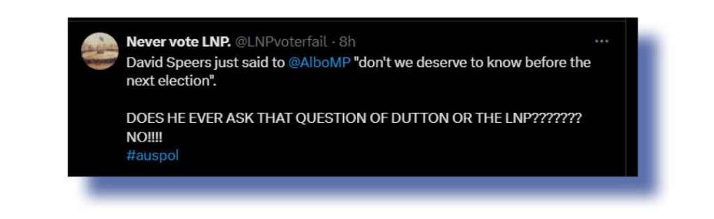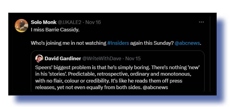 Before we leave Insiders, here are some general, critical, observations about that program from Never vote LNP. on climate change targets, and Solo Monk on the show’s host. My. My. Doesn’t David Speers generate a lot of the xcrement we shovel week by week?