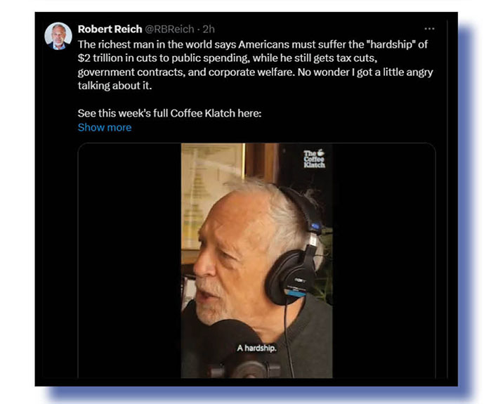 And seeing we’ve somehow gone back to things Trump, let’s finish off with Politic@l Spinner and Robert Reich, whose X contributions we should have included when compiling yesterday’s posts on the village idiot. See what we did there? Working our way back to the beginning. It’s almost a trumpian weave!